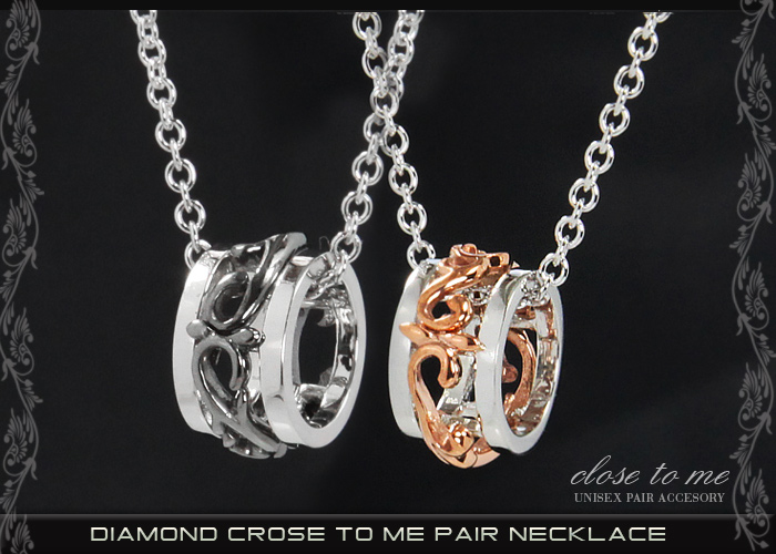 シルバーの鏡面を存分に発揮したリングにアラベスク(唐草)を透かし彫りにした 神秘的でクールでオシャレなペアネックレス。 男性にはクールでワイルド感溢れるブラッククロスを 女性には優しさ・柔らかみ溢れるピンククロスをセット。 二人の愛が結ばれてる証・・・高級感溢れるペアネックレスです。