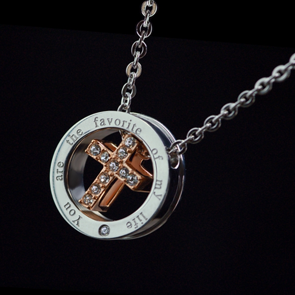 リングそれぞれにメッセージが刻印されています。 You are the favorite of my life 〜私の人生で一番愛する人。〜 永遠を意味するリングに囲まれるのはクリスタルフル使いのクロス★ 一緒にいなくても二人でお揃いのペアがあれば 離れていてもお互いの愛が感じられるペアネックレスです。