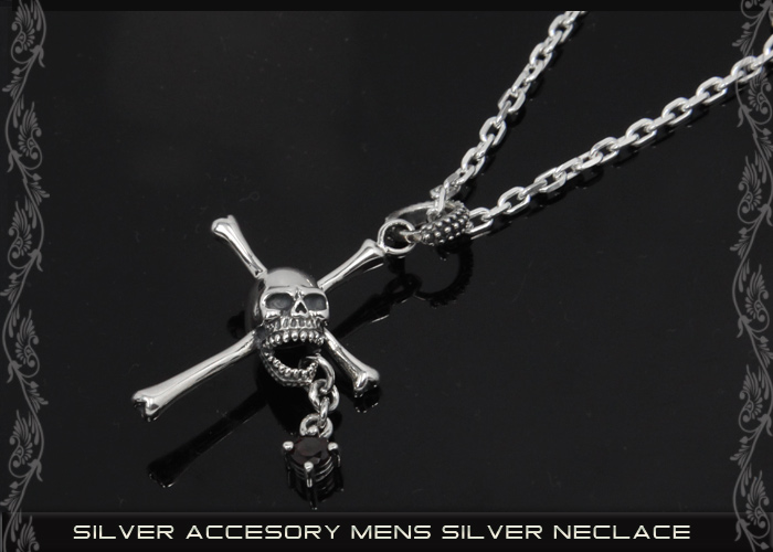 シルバーの鏡面を存分に発揮した本物志向のネックレス あなたを彩るクールなシルバーアクセサリーでキメル★ 骨をクロスさせた中央にはドクロ、 その口先のガーネットジルコニアが怪しく輝きを放つ。 存在感抜群、こだわり抜いたこのディール!