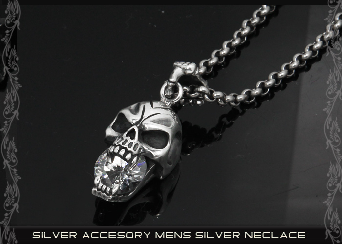 シルバーの鏡面を存分に発揮した本物志向のネックレス あなたを彩るクールなシルバーアクセサリーでキメル★ 怪しげな表情なドクロが大粒のジルコニアをくわえて 迫力感溢れるディールになっている。 バチカン部分は骸骨の手になっているこだわり様。