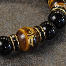 身を守ってくれる守護神の力である古代文字があなたを守護してくれる申(さる)・未(ひつじ)年生まれの守護神、梵字バンのメンズパワーストーンブレスレットです。梵字彫り黄虎目石、オニキス、金黒ロンデルパーツを融合したデザイン性を重視した見る者に存在感を与えファッションセンス抜群の高品質でスタイリッシュなカッコイイ本物志向のブレスレットです。 どんなスタイルにもマッチしやすいおしゃれに身に付けられるパワーストーンを厳選 したまさにオンリーワンのパワーストーンブレスレットです。
