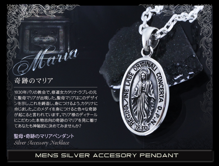 1830年パリの教会で、修道女カタリナ・ラブレの元に聖母マリアが出現した。聖母マリアはこのデザインを示し、これを鋳造し、身につけるよう、カタリナに命じました。このメダイを身につけると色々な奇跡が起こると言われているメダイのデザインがまるでマリア像のような美しい風合いを発揮したマリアペンダントで決めてみませんか?