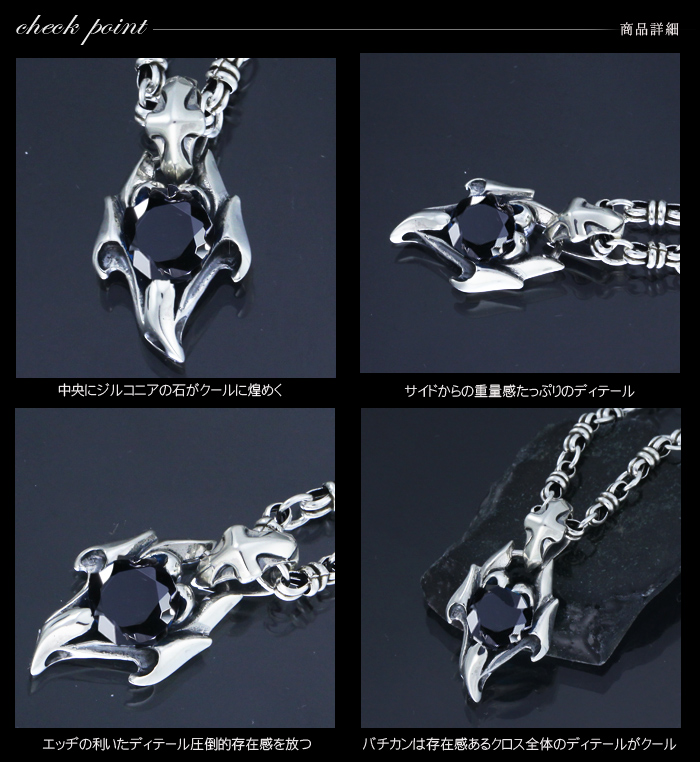 エッヂを生かしたカーブがかつてない存在感を発揮。中央に大振りの 漆黒のブラックダイヤCZがあらゆる角度からクールに輝きを放つ圧倒的存在感のシルバーネックレス。バチカンのクロスとの一体感が抜群にセンスとワンランク上のファッションスタイルを確立。女性陣から男性に着用してほしいベストランキングに独占1位を獲得したこのメンズネックレスを胸元に取り入れることで、あなただけのオンリーワンのファッションでクールに決めてください。