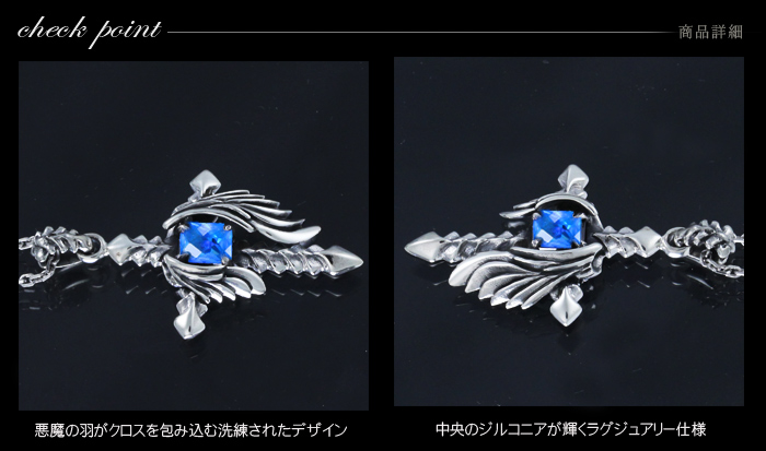 悪魔の羽を見事に再現した超越したスタイルのセフィロスクロスペンダント。中央にはスクエアのストーンが輝き、その存在感は、見るもの全てにデザインセンスとカッコよさに優越感さえ覚えるあなただけのオンリーワンのシルバーアクセサリーでクールに決めてみませんか?