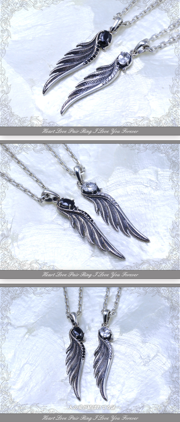 繊細な羽が二人お揃いのネイティブテイストで愛を確かめ合うペアネックレス。彼氏にはシックでクールなブラックジルコニアを、彼女には輝きのキラキラのホワイトジルコニアをセットしたふたりの愛が結ばている証の本物志向のペアネックレスです。