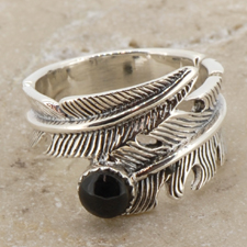 羽をグルリとしたどこからのアングルでも羽とわかる存在感のある見る者を圧倒し存在感を演出するフォルム。羽の先端にはネイティブアメリカンの真髄である漆黒のオニキス石がセットされたシルバーの繊細な羽とのコントラストが利いた気品溢れる逸品。 シルバーの鏡面を存分に発揮した本物志向のシルバーリングです。 使い込んでこそ味が出るシルバーアクセでこれからの時代を刻み込む まさにオンリーワンのシルバーアクセサリーです。