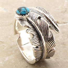幅13.5mmの迫力!エッヂの効いた繊細な羽にトルコ石・ブルーターコイズをセッティングし、かなり渋い仕上がりに完成されたこれぞ本物志向のネイティブシルバーリングです。