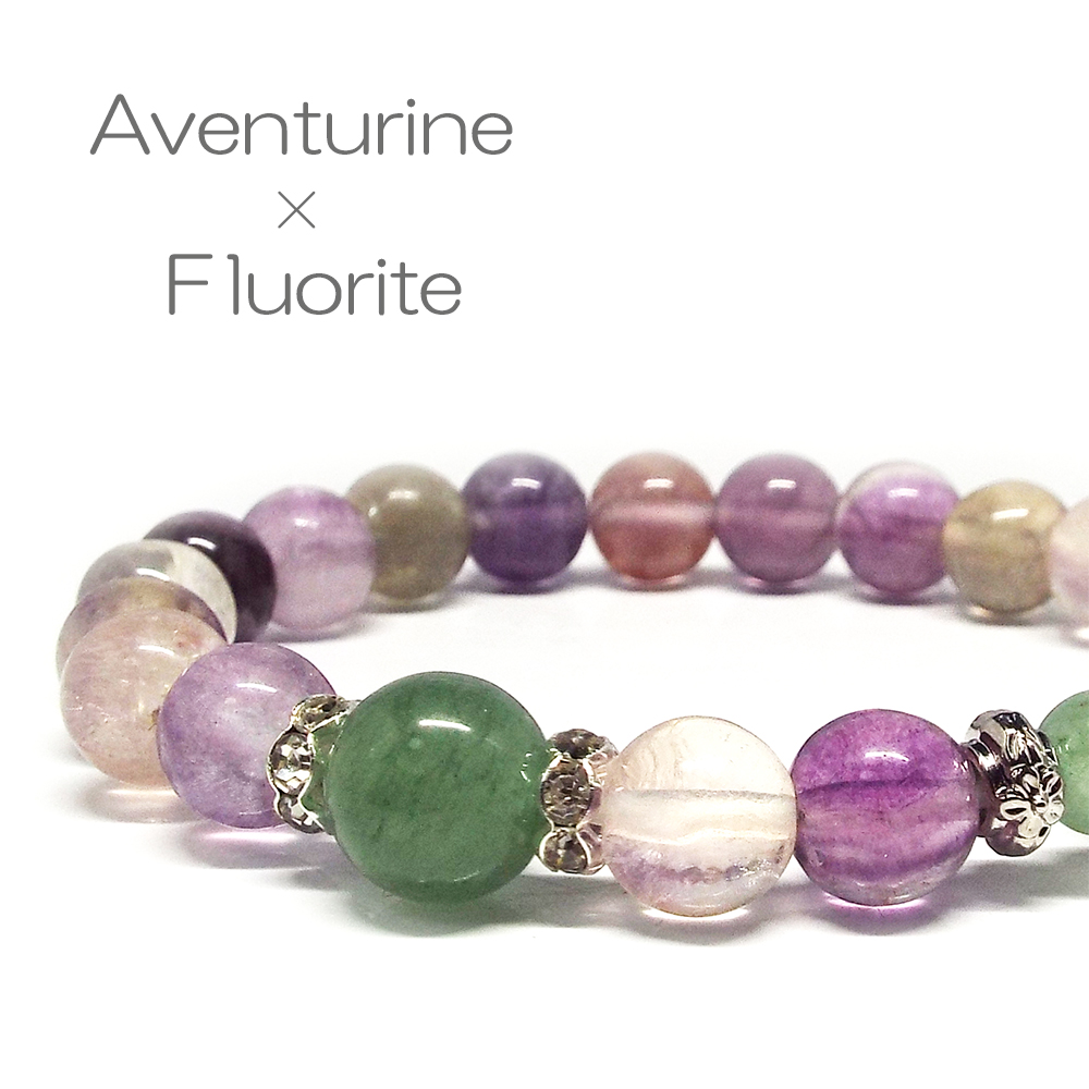 ☆環境に順応、心身の疲労を緩和する☆ アベンチュリンは派手さはありませんが ゆっくりとした平和な波動を送ってくれます。 イライラする心を穏やかにしてくれる優しい石です。 森林の中にいるような安息間を与えてくれます。 フローライトは自分自身が持っている力を最大限に発揮し、 全ての能力を引き出す石と言われています。 特に芸術的な部分での才能を伸ばす力があります。 また夢の実現を手助けする石ともされており願望達成に効果があります。 ファッションセンス抜群のパワーストーンブレスレットです。 自分へのご褒美・プレゼントにも大変喜ばれます。