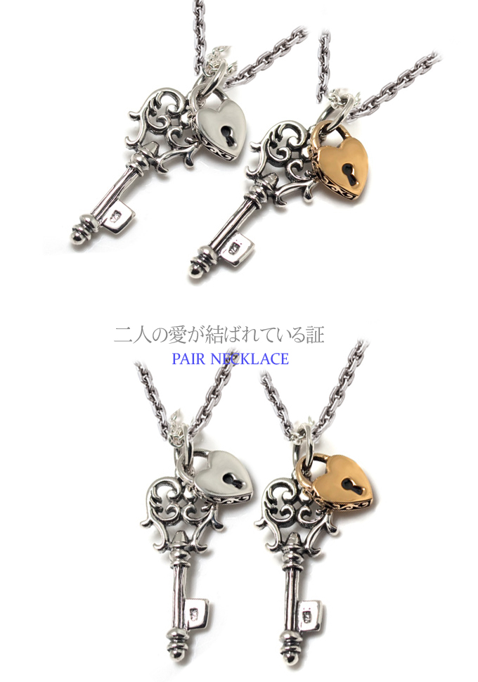 彼氏にはクラシカルなキーデザイン。サイドの彫金が美しいハートのチャームお洒落なスタイル。彼女には愛らしい、ゴールドのアクセントの輝きが美しいアイテムです。カジュアルにもフォーマルにも合うペアに仕上げました。2人の愛が結ばれてる証のペアネックレスです。