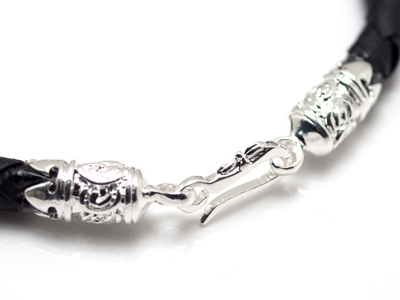 編み込んだレザーを透かし彫りの飾りに通したブレスレット。流麗なパルメットモチーフとブラックジルコニアの組み合わせが気品を感じさせます。 シルバーの鏡面を存分に発揮した本物志向のレザーブレスレットです。 プレゼントやギフトにも大変喜ばれる本物志向の シルバーアクセサリーブランドRoyal Justyのシルバーブレスレットはどんな装いにも キマルのであなただけのオンリーワンを発揮していろいろな場面で大活躍してくれます!