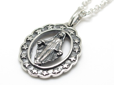 カジュアルなデザインのマリアモチーフペンダント。いぶしのきいたフレームに並ぶスターがアクセントのロックテイストでありながら神秘的なアイテムです。先進的なイメージを主張する存在感抜群のシルバーペンダントです。 プレゼントやギフトにも大変喜ばれる本物志向の シルバーアクセサリーブランドRoyal Justyのメンズシルバーペンダントはどんな装いにも キマルのであなただけのオンリーワンを発揮していろいろな場面で大活躍してくれます!